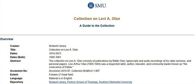 Bridwell Library Archival Collection on Rabbi Levi A. Olan